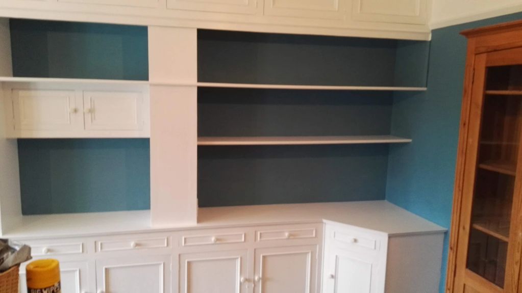 This built in unit had been previously painted by a non professional .With no preparation work and incompatible paints the finish could be easily scra